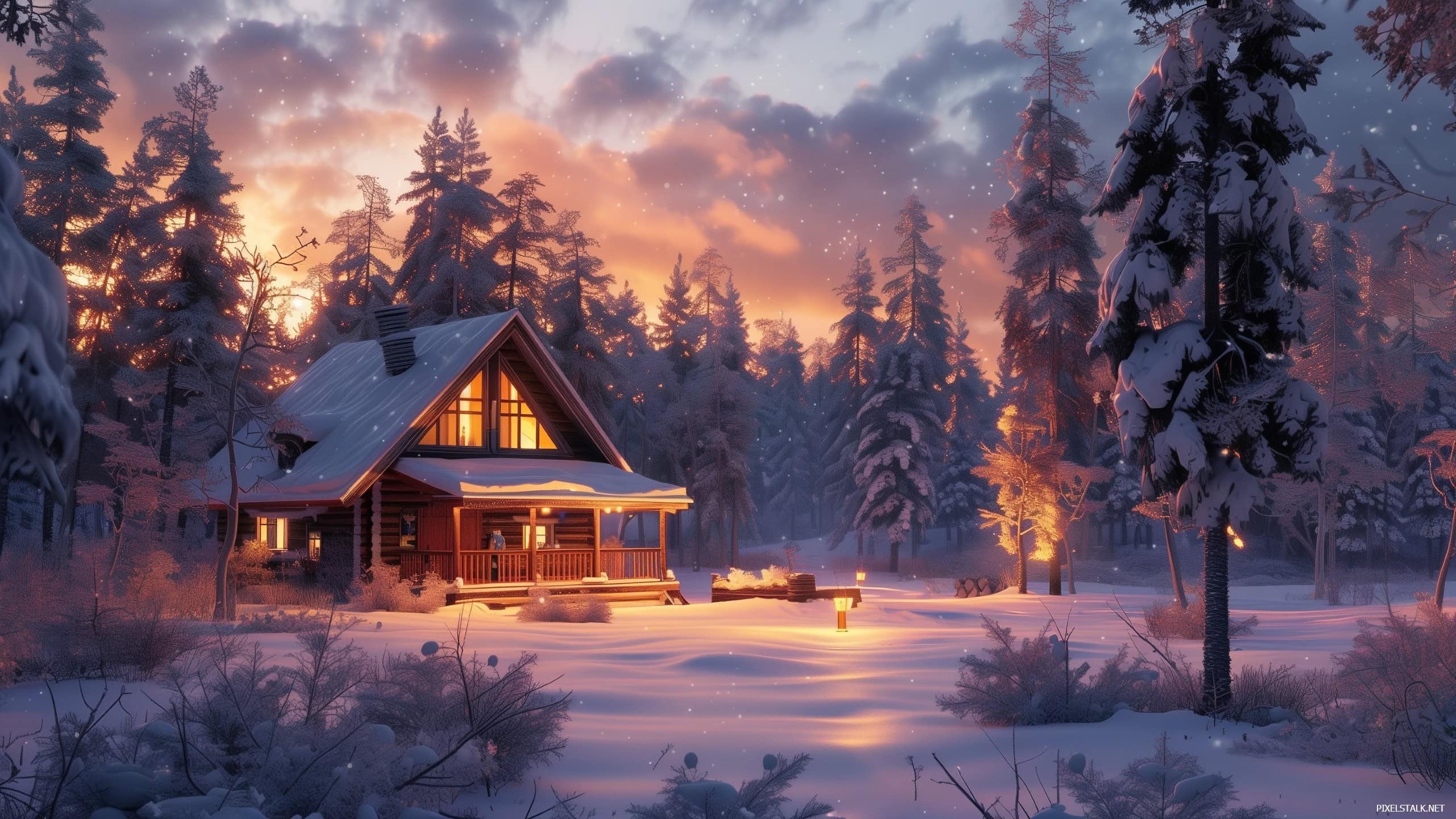 Cozy winter cabin surrounded by snow-covered pine trees during sunset.